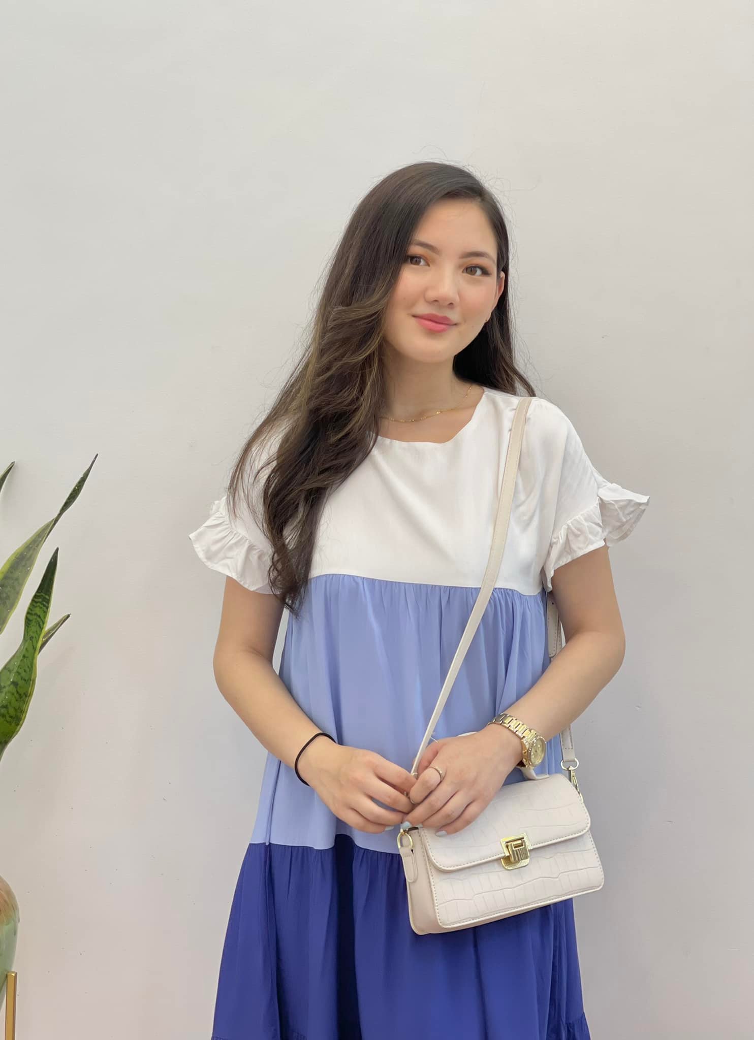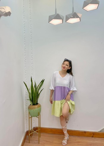 Women's contrast color midi Dress with Loose Ruffle sleeves and Round neck